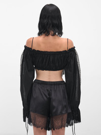 A cropped black cotton top featuring lace paneling and ruching at the neckline and cuffs. Spaghetti straps, off-shoulder styling, and button closure define the relaxed cut. Featuring: • Relaxed fit • Patterned lace paneling throughout • Cropped silhouette • Off-shoulder straight neckline • Spaghetti straps • Front button closure • Ruching at neckline and cuffs • Made in Italy • 100% Cotton • Standard sizing Model is 5'7" wearing size 38. Bust: 32" Waist: 25" Hips: 34"