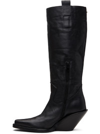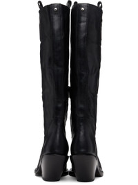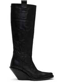 Knee-high washed and grained calfskin boots. · Pointed square toe · Rivet and pull-loops at collar · Zip closure at inner side · Stacked leather midsole and block heel · Suede sole with rubber injection · Heel: H3.5" Supplier color: Black Upper: calfskin. Sole: leather, rubber. Made in Italy 252378F114000