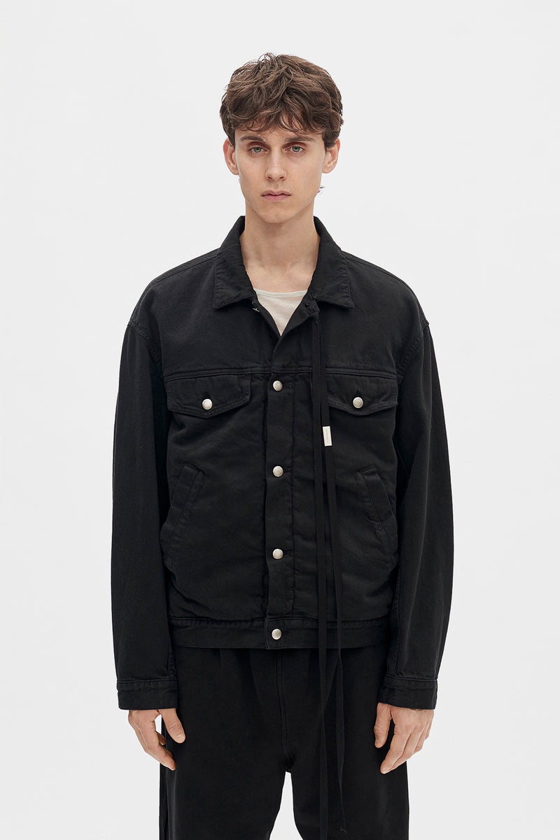 Men's Patrick five pockets jacket- Black Denim- Over Size Fit- Black ribbon detail- button closure- 100% Cotton- Made in Italy Model wears Italian size 48 Height: 188 cm Waist: 73 cm Hips: 86 cm The fit of this item is oversize. If you prefer a narrow fit, consider purchasing this item two sizes down from your usual size.