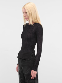 Oke long sleeve crop top in black ribbed wool blend with side ruched gathering and curved raw-edge hem. Featuring: • Slim fit • Ribbed wool-blend construction • Round neckline • Side ruched gathering • Curved raw-edge hem • Made in Italy • Main: 80% Wool 20% Polyamide • Standard sizing Model is 5'9" wearing size S. Bust: 32" Waist: 25" Hips: 34"