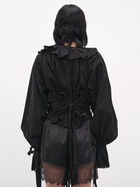 A black cotton poplin top with a cropped oversized silhouette and voluminous ruffled hems. Balloon sleeves, gathered cuffs, and self-tie draping at the back complete the layered construction. Featuring: • Oversized fit • Lightweight cotton poplin construction • Draped silhouette • Voluminous ruffled hems and layering • Balloon sleeves with gathered cuffs • Self-tie fastening and draping at back • Cropped length • Made in Italy • 100% Cotton • Standard sizing Model is 5'7" wearing size 40. Bust: 32" Waist: 25" Hips: 34"