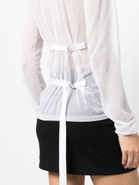 sheer long-sleeve T-shirt Highlights - White - Cotton blend - Sheer - Round neck - Long sleeves - Rear tie fastening - Straight hem Made in Italy Composition Cotton 82%, Polyamide 18% SIZE & FIT Model measurements Height 5 ft 10 in(1.79 m) Bust/Chest 33.07 in(84 cm) Hips 37 in(94 cm) Waist 25.19 in(64 cm) FittingInformation Designed for a slim fit that sits just away from the body offering a close yet comfortable fit The belt offers adjustability for fitted preferences Made with a lightweight knit, this piece offers some stretch This piece fits true to size – take your usual size
