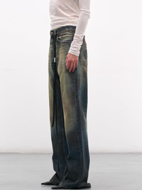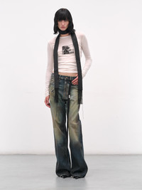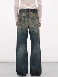 Vintage blue denim trousers with a faded and dirtied wash, distressed finishes, and raw-edge hems. A flared relaxed fit is structured with five-pocket styling, grosgrain ribbon, and back leather patches. Featuring: • Relaxed fit and flared leg • Heavyweight cotton denim construction • Dirtied and faded wash • Distressing throughout • Raw-edge hem detailing • Front button and zip fly closure • Five-pocket styling • Signature grosgrain ribbon • Back leather patches • Made in Italy • 100% Cotton • Italian sizing Model is 5'7" wearing size 38. Bust: 32" Waist: 25" Hips: 34"