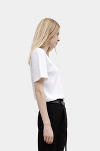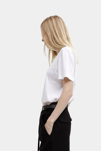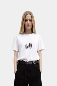 Women's Carolien short sleeves t-shirt- White- Short sleeves- Front black holy print- 100% Cotton- Made in Portugal Model wears Italian size 40 Height: 179 cm Waist: 61 cm Hips: 90 cm