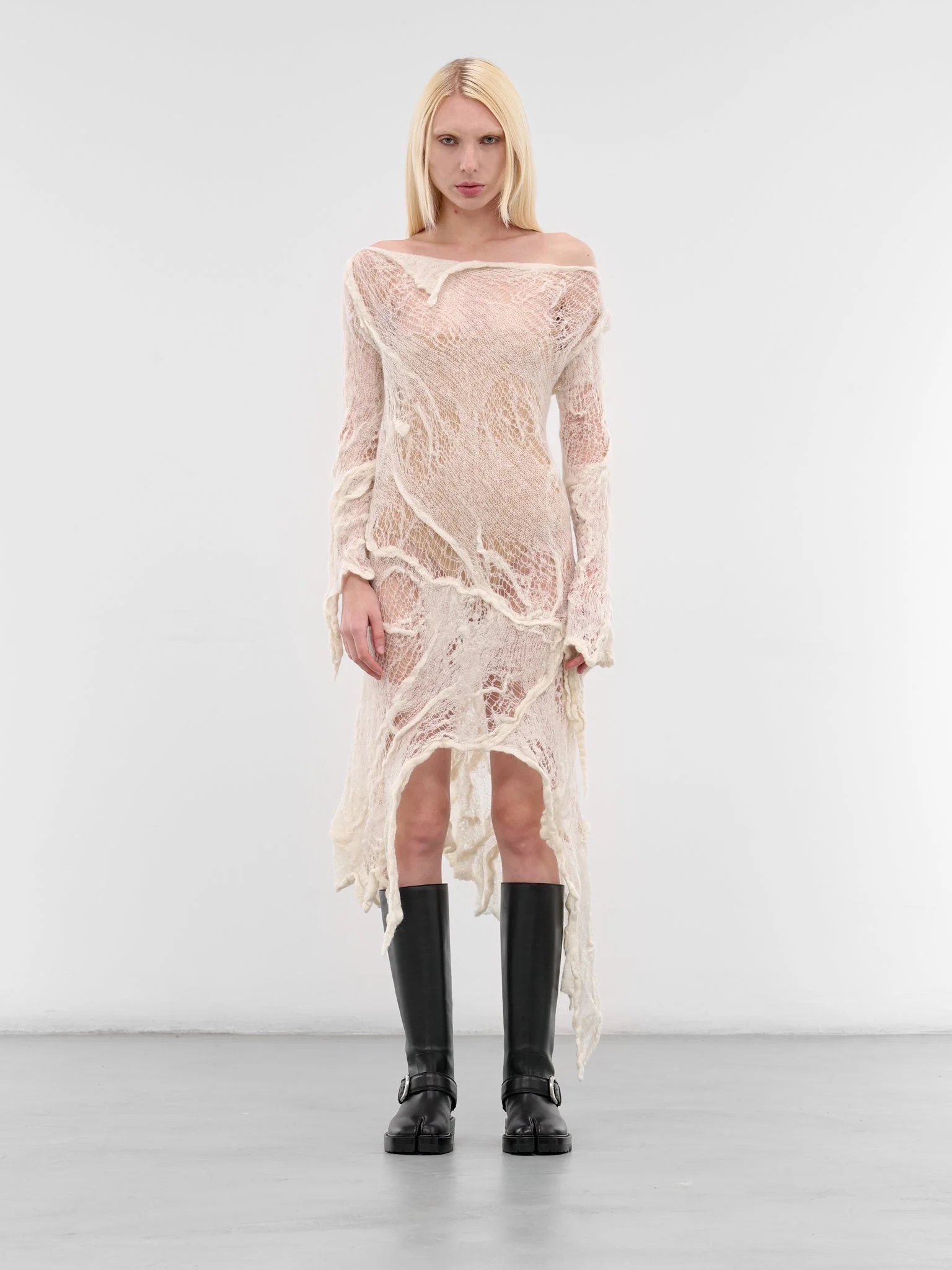 Featuring: • Draped silhouette • Floor length • Ripped sheer alpaca wool knit • Off-the-shoulder neckline • Draped cuffs with self-tie signature • Side split • Made in Italy • 45% Alpaca 35% Polyamide 20% Wool • Standard sizing Model is 5'9" wearing size S. Bust: 32" Waist: 25" Hips: 34"