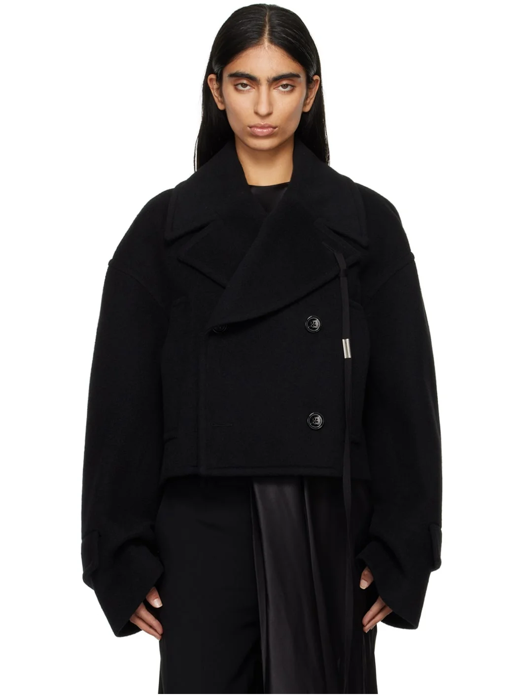 Wool-blend melton jacket. · Detachable grosgrain strap with logo plaque at notched lapel · Double-breasted button closure · Welt pockets · Dropped shoulders · Flap pocket at cuffs · Welt pockets at interior · Full twill lining Supplier color: Black Body: 70% wool, 30% polyamide. Lining 1: 52% viscose, 48% cotton. Lining 2: 100% cupro. Lining 3: 100% cotton. Made in Italy 242378F063000