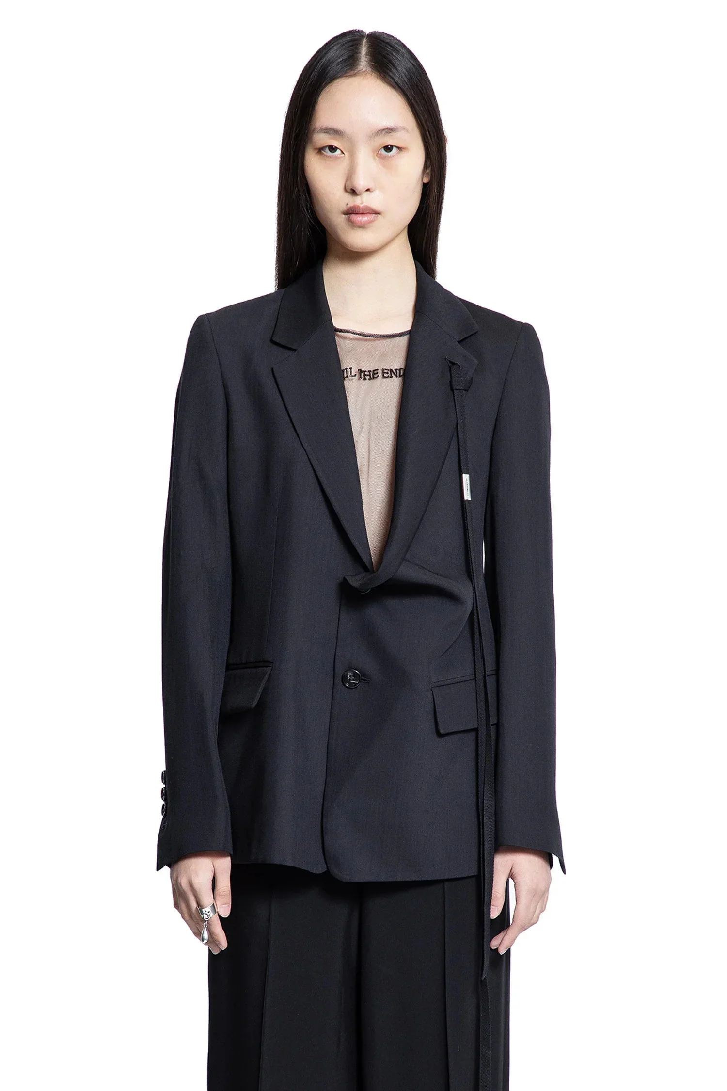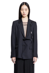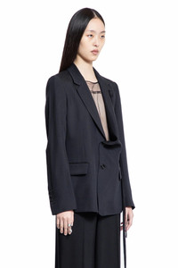 DESCRIPTION - Black - Notched lapels - Asymmetric button closure - Side flap pockets - Front signature ribbon with engraved logo plaquette - Long sleeves - Buttoned cuffs - Darted back - Back split - The fit of this item is regular. You may consider purchasing your usual size. DETAILS - Made in: Italy - Composition: 79% Viscose 21% Wool - Model code: B0012411FA556 099 - Item ID: 9502206787926 SIZE & FIT Model wears size 40 Model Height 177 cm Bust 76 cm Waist 63cm Hips 89 cm
