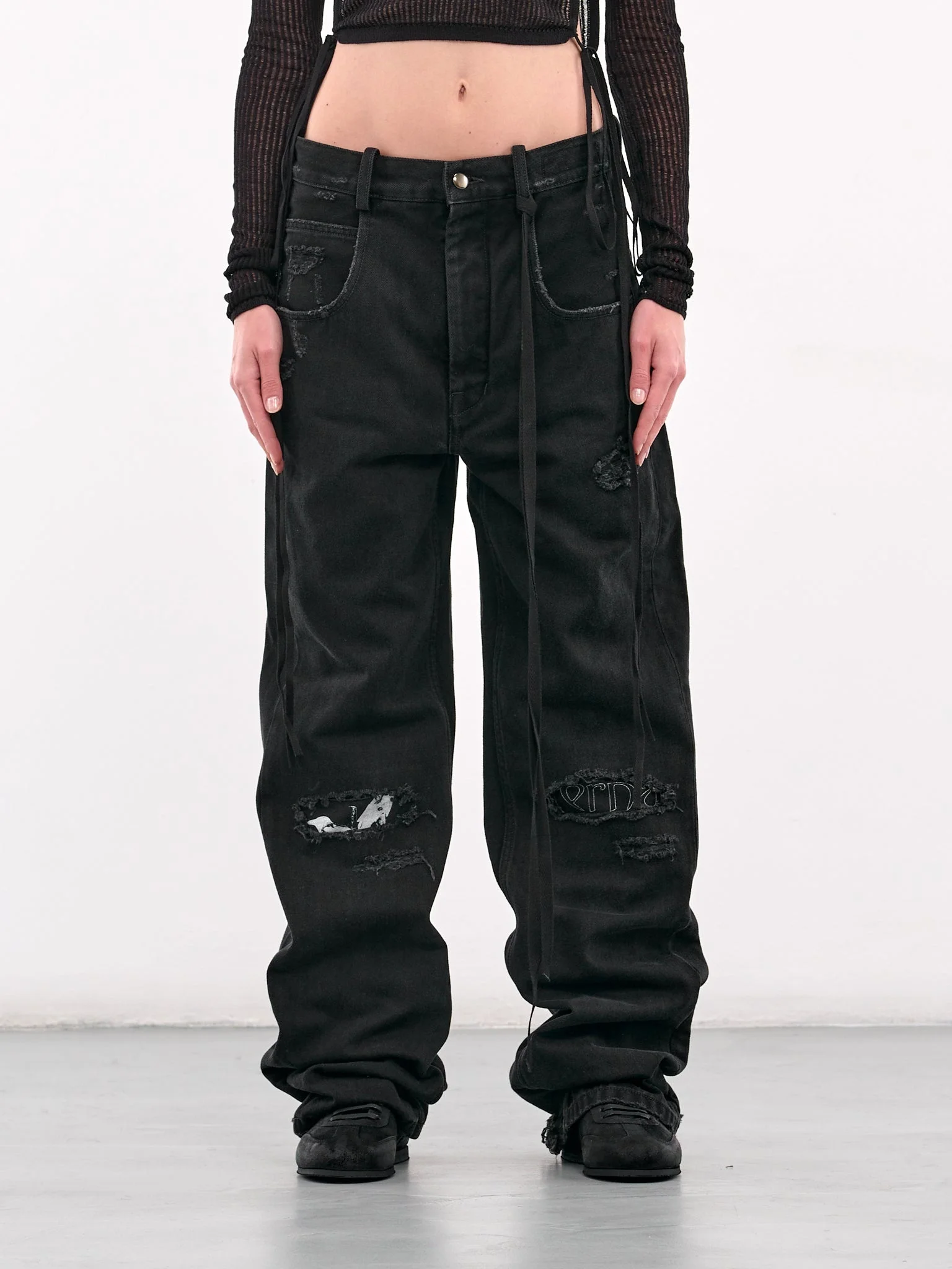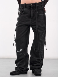 ANN DEMEULEMEESTER jeans in black, paneled denim construction, graphic patches, distressing, belt loops, signature grosgrain ribbon, front button & concealed zip fly closure, inset pockets, coin pocket, back patch pockets, wide leg, baggy fit. Italian Sizing Model is 5'8" wearing size 38. Bust: 32" Waist: 24" Hips: 35"