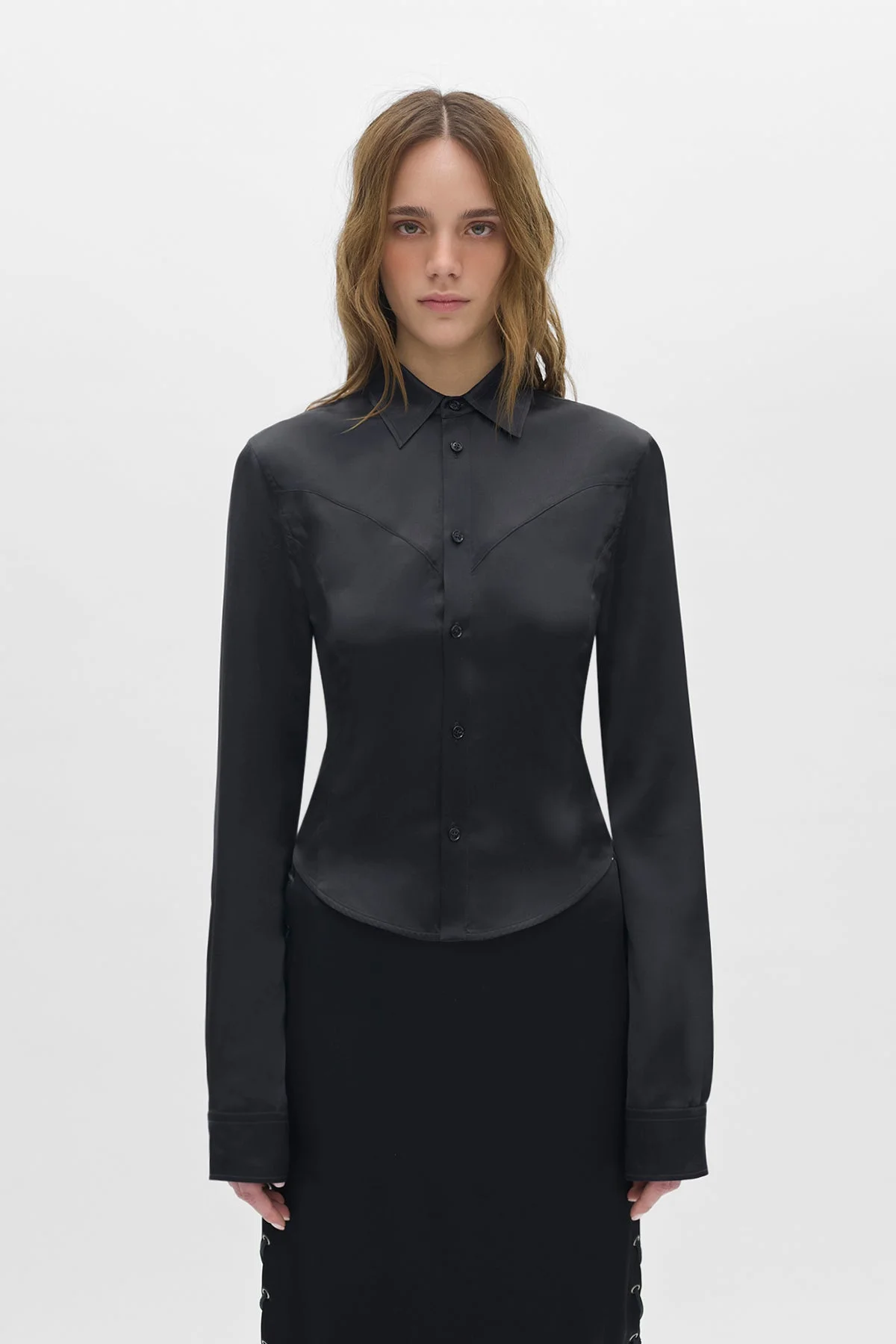 Drika Fitted Shirt with Western Cut – Black – Snap button front closure - Long sleeves with snap cuffs - 100% Silk – Made in Italy Model wears italian size 40 The fit of the item is narrow. Please consider this when selecting your size. Care To maintain the beauty and integrity of your purchase, we recommend treating it with care. Simple maintenance practices, such as gentle washing and proper storage, can effectively preserve the longevity of your favorites. We encourage you to refer to the care instructions included with each item, designed to help you keep your purchase in top condition. Design Our dedication to excellence extends beyond materials; it encompasses the artistry and craftsmanship illustrated in every piece we create.