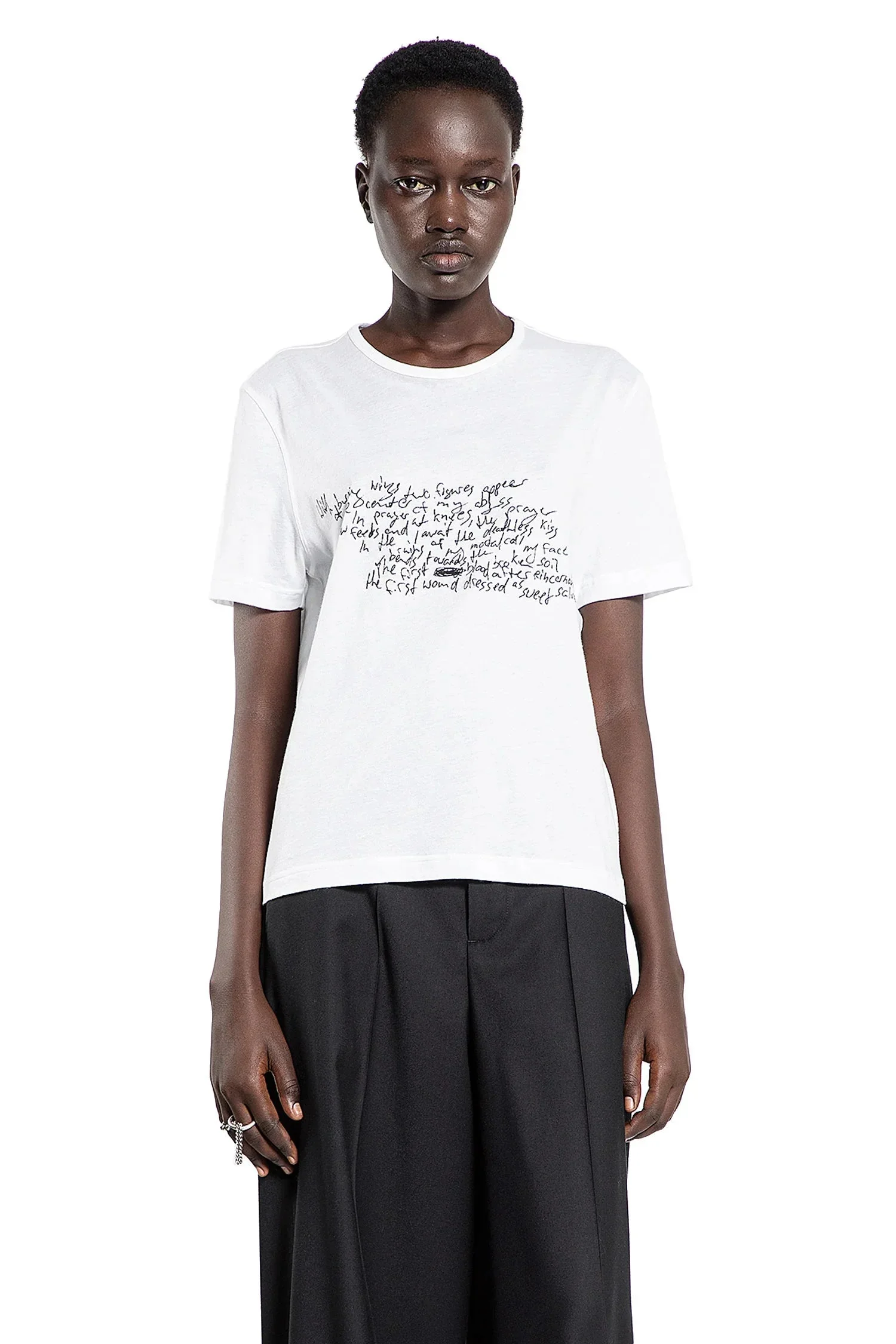 DESCRIPTION - white - brushed cotton jersey - round neck - front poem print - dropped shoulders - short sleeves - regular fit - The fit of this item is regular. You may consider purchasing your usual size. DETAILS - Made in: Portugal - Composition: 100% Cotton - Model code: B0012323FA206 001 - Item ID: 9046245966166 SIZE & FIT Model wears size S Model Height 177 cm Bust 74 cm Waist 58 cm Hips 85 cm