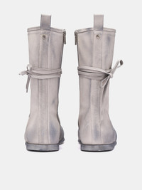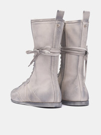 ANN DEMEULEMEESTER boots in chalk, leather construction, suede texturing, worn effect, calf-high, heel pull tab, lace-up fastening, signature grosgrain strap, back rivet, round toe & overlay, low-profile rubber sole, lined. Made in Italy 100% Calfskin Italian Sizing