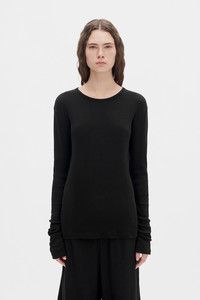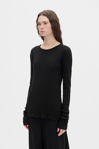 Fiene Long Sleeve T-Shirt - Black - Cotton Rib Jersey - Round Neck - Dropped Shoulders - Long Sleeves - Slim Fit - 100% Cotton - Made in Italy Model wears size S The fit of the item is narrow. Please consider this when selecting your size. Care To maintain the beauty and integrity of your purchase, we recommend treating it with care. Simple maintenance practices, such as gentle washing and proper storage, can effectively preserve the longevity of your favorites. We encourage you to refer to the care instructions included with each item, designed to help you keep your purchase in top condition. Design Our dedication to excellence extends beyond materials; it encompasses the artistry and craftsmanship illustrated in every piece we create.