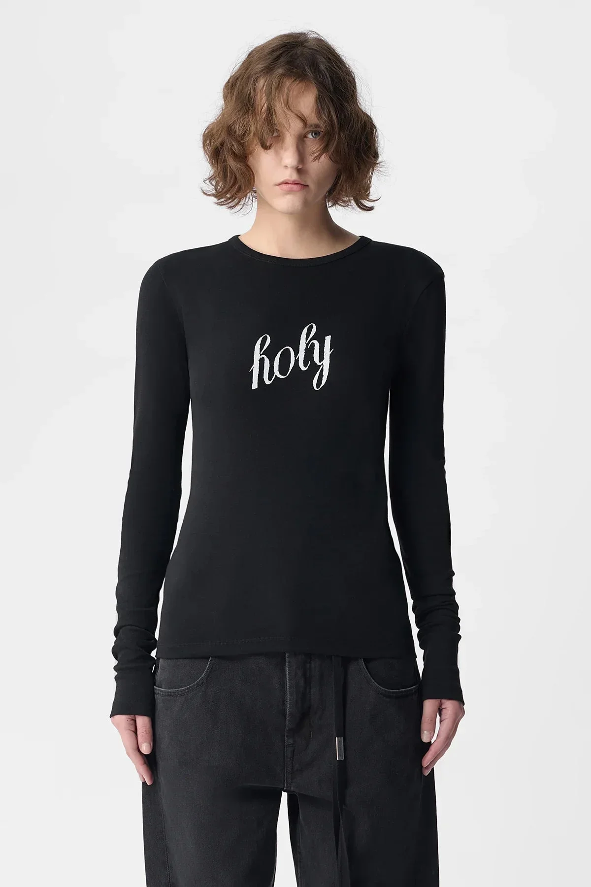 Fiene Printed Long Sleeve T-Shirt- Black - Cotton Jersey - Round Neck - Front Holy -Embroidery - Dropped Shoulders - Long Sleeves - 100% Cotton -Made in Portugal. The fit of this item is regular. Consider to purchase your usual size. Model wears italian size S Height: 176 cm Waist: 60 cm Hips 88 cm Care To maintain the beauty and integrity of your purchase, we recommend treating it with care. Simple maintenance practices, such as gentle washing and proper storage, can effectively preserve the longevity of your favorites. We encourage you to refer to the care instructions included with each item, designed to help you keep your purchase in top condition. Design Our dedication to excellence extends beyond materials; it encompasses the artistry and craftsmanship illustrated in every piece we create.