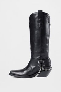 Finnbo Santiago Boots With Belts - Black - Cowhide Leather - Western-Inspired Silhouette - Multiple Buckled Straps - Under-Heel Metal Chain Detail - Pointed Toe - Side Zip Closure - Stacked Heel - Leather Sole - 100% Cow Leather - Made in Italy Ann Demeulemeester shoes embody the essence of luxury and comfort. The generously wide fit is a design choice aimed at ensuring a comfortable wear. For those who prefer a snugger fit, we recommend using an insole. Crafted from the highest quality leather, it is natural for the shoes to feel stiff initially. By wearing and walking in them, they will perfectly mold to the shape of your feet, offering unparalleled comfort. Care To maintain the beauty and integrity of your purchase, we recommend treating it with care. Simple maintenance practices, such as gentle washing and proper storage, can effectively preserve the longevity of your favorites. We encourage you to refer to the care instructions included with each item, designed to help you keep your purchase in top condition. Design Our dedication to excellence extends beyond materials; it encompasses the artistry and craftsmanship illustrated in every piece we create.