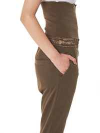 Ann Demeulemeester knit joggers in olive, extended waist panel above tonal elastic waistband, faux-fly detail, side hand pockets, rear single-welt pockets, ribbed cuffs at hem, tonal stitching. Made in Portugal. Composition - 100% Cotton; 100% Acetate (Fabric 2) Model is 5ft 10” and wearing a size 38. Bust: 32” Waist: 26” Hip: 31.5”