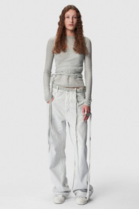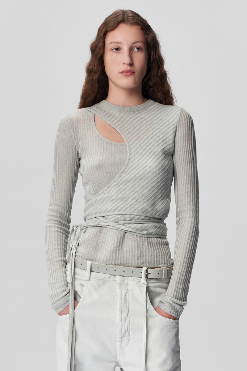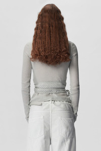 Women's Iduna Draped Top - Aqua Marine - Brushed Fine Cotton Ribbed-Knit - Layered - Round Neck - Wrap-Around Self-Tie Straps - Long Sleeves - Fitted - 100% Cotton - Made In Italy Model wears the size S Height:180 cm Waist:60 cm Hips:88 cm
