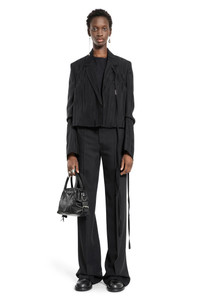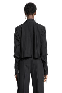 DESCRIPTION - Black - Striped viscose - Notch lapels - Removable signature grosgrain ribbon - Chest pocket - Dropped shoulders - Slouched sleeves - Buttoned cuffs - Cropped hem DETAILS - Made in: Italy - Composition: 100% Viscose - Model code: B0011116FA564 099 - Item ID: 9424210657622 SIZE & FIT Model wears size 40 Model Height 177 cm Bust 77 cm Waist 59 cm Hips 86cm