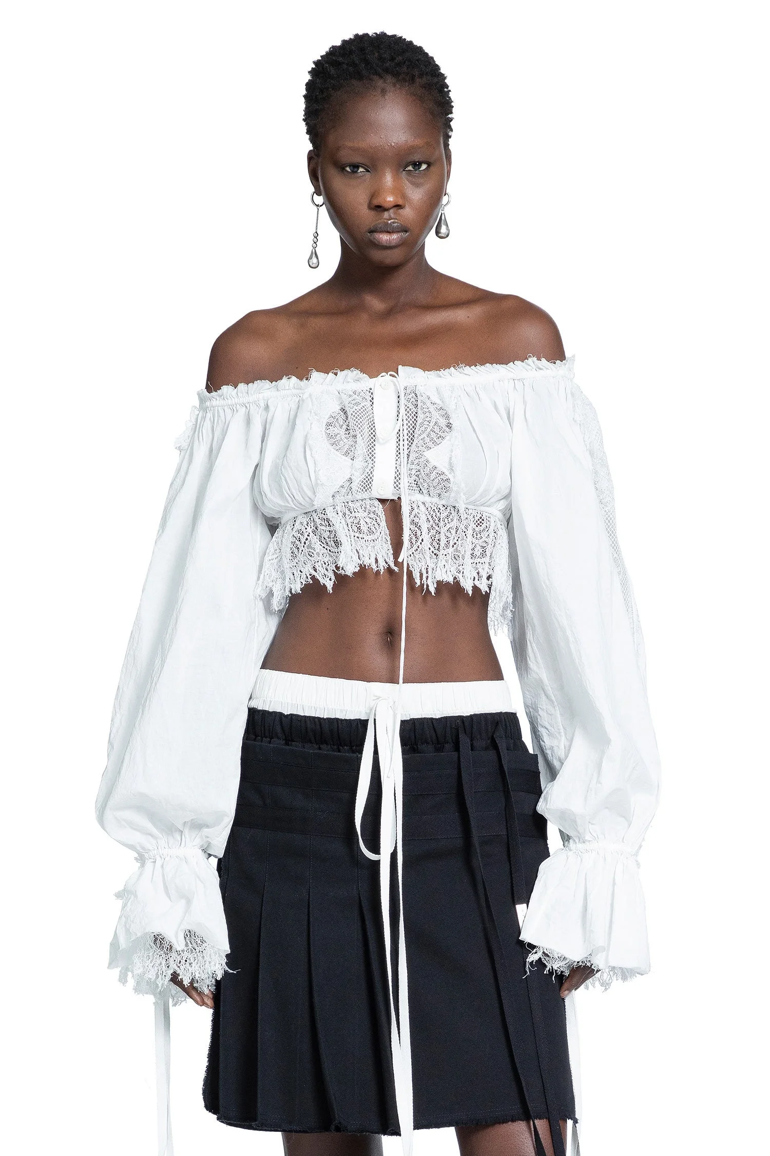 DESCRIPTION - Natural white - Cotton muslin and lace - Ruffled raw-edge off-the-shoulders neckline - Gathered - Button closure - Lace hem - Drawstring cuffs - Cropped fit DETAILS - Made in: Italy - Composition: 100% Cotton - Model code: B0013587FA026 002 - Item ID: 9759834702166 SIZE & FIT Model wears size 40 Model Height 177 cm Bust 74 cm Waist 58 cm Hips 85 cm