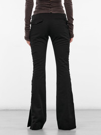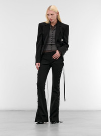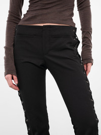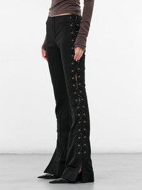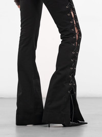 Featuring: • Slim fit • Flared leg • Low waist • Concealed zip fly closure • Front welt pockets • Back flap and welt pockets • Eyelets and lacing at sides • Vents at hems • Made in Italy • 100% Cotton • Italian sizing Model is 5'9" wearing size 38. Bust: 32" Waist: 25" Hips: 34"