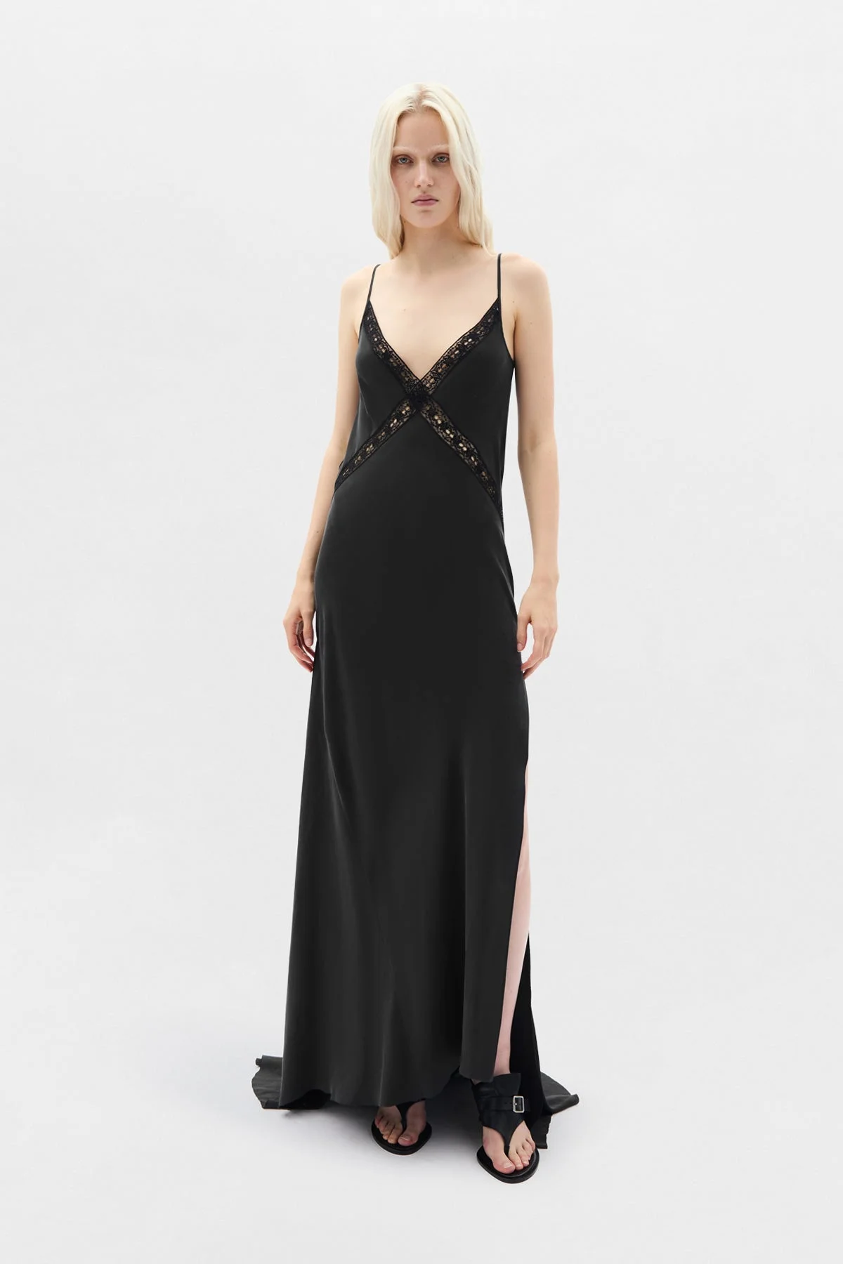 Lala X-Long Bias Dress - Black - 100% Silk - Lace Detail - Spaghetti Straps - V-Neckline - Side Slit - Floor-Length Hem - Made in Italy Model wears italian size 40 Care To maintain the beauty and integrity of your purchase, we recommend treating it with care. Simple maintenance practices, such as gentle washing and proper storage, can effectively preserve the longevity of your favorites. We encourage you to refer to the care instructions included with each item, designed to help you keep your purchase in top condition. Design Our dedication to excellence extends beyond materials; it encompasses the artistry and craftsmanship illustrated in every piece we create.