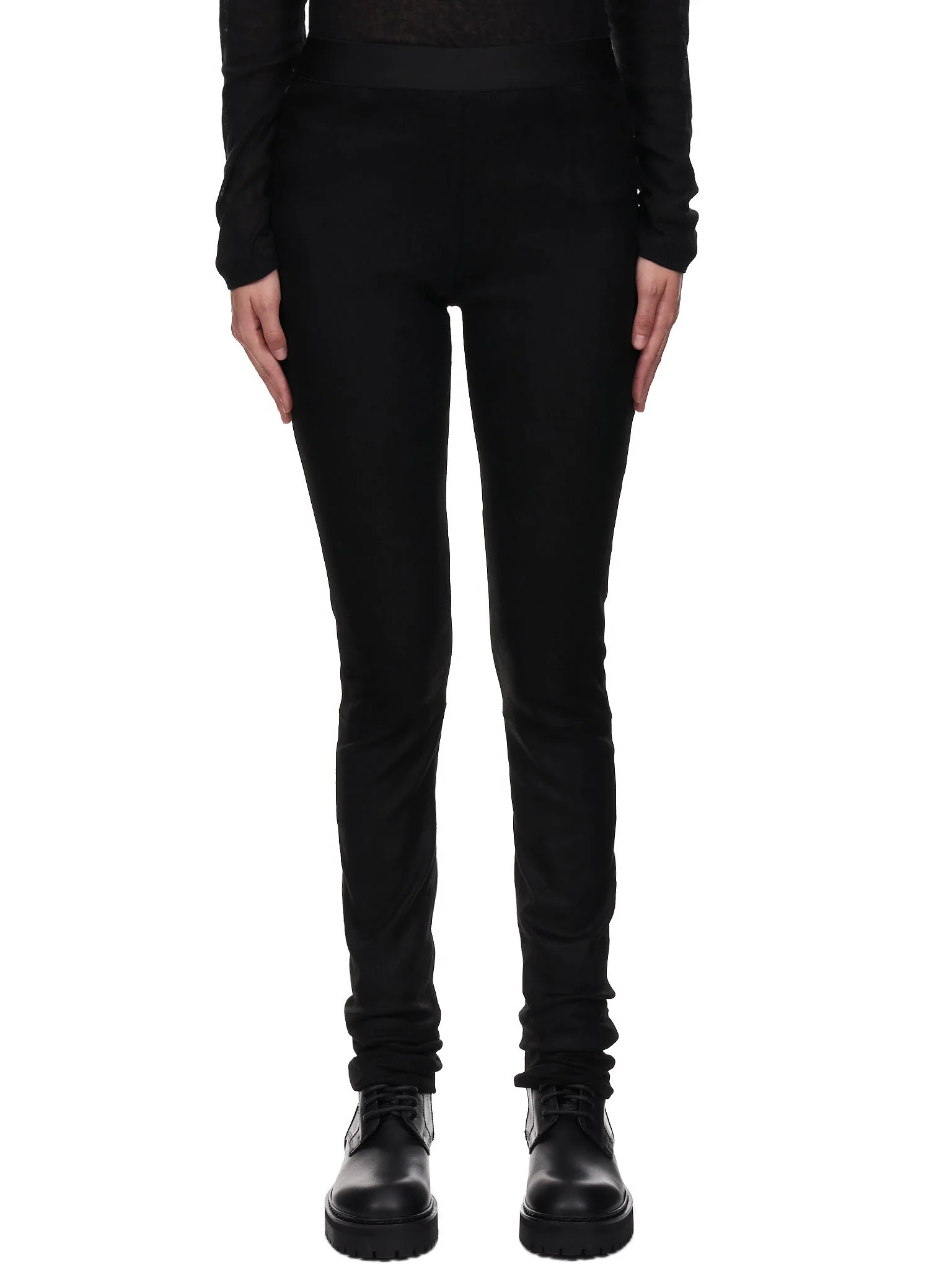 Ann Demeulemeester leggings in black, elasticized waistband, leather shell, paneled construction, lined, fitted silhouette. Made in Italy. Italian Sizing Composition - (Shell) 100% Leather, (Lining) 97% Cotton, 3% Elastane. Model Measurements: Model is 5ft 8” and wearing a size 36. Bust: 34” Waist: 24” Hip: 34"