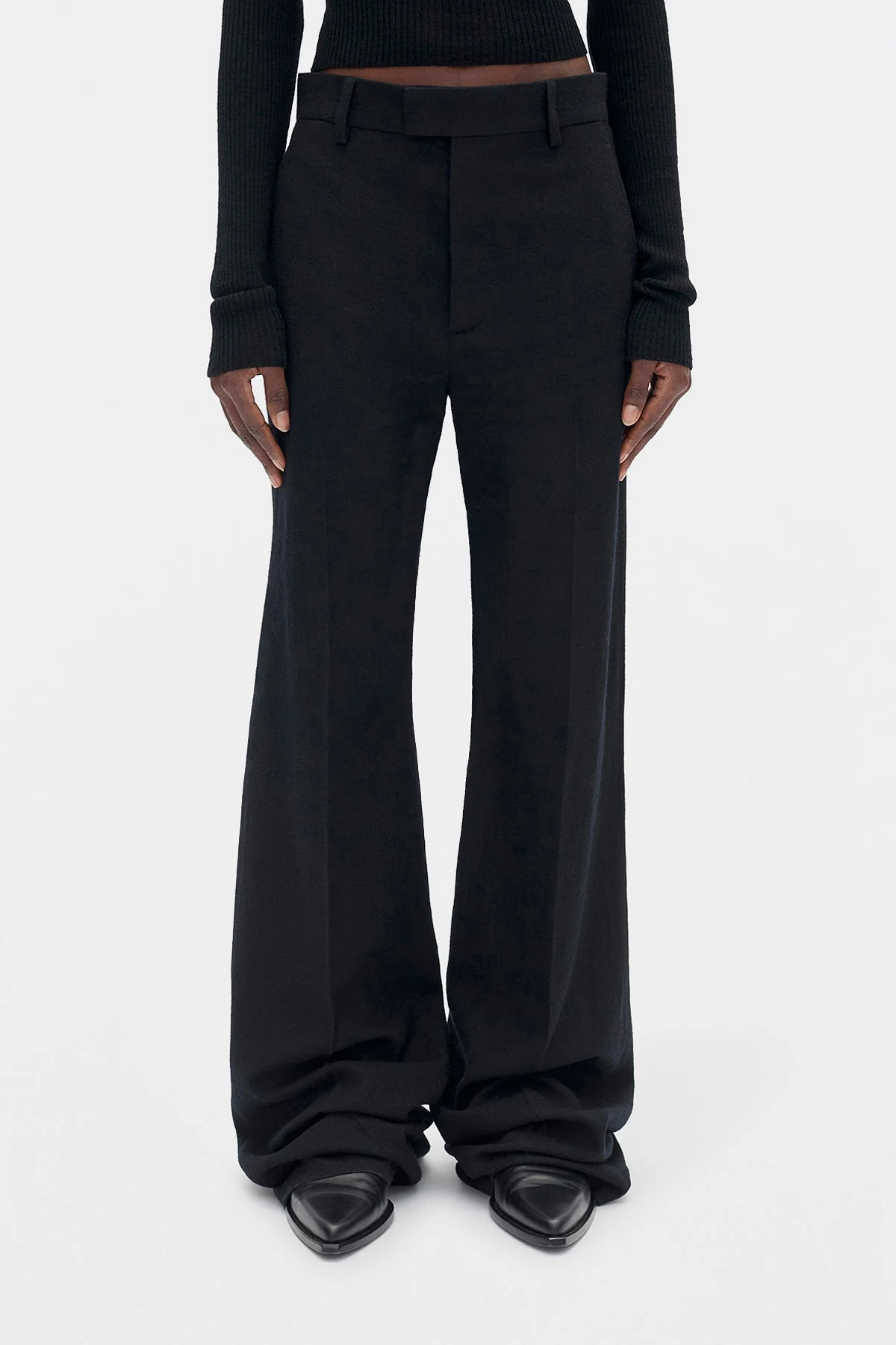 Maaike Flared Comfort Trousers in Brushed Wool - Black - Brushed Wool - Belt Holes - Hook and Zip Closure - Side Pockets - Asymmetric Back Pockets - Flared Leg - Comfort Fit - 100% Virgin Wool - Made in Italy