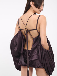 ANN DEMEULEMEESTER dress in eggplant, draped design, liquid viscose satin construction, asymmetric off-shoulder neckline, spaghetti straps, detachable puff sleeves, open back, back self-tie fastening, draped paneling, mini length, relaxed fit. Made in Italy 100% Viscose Italian Sizing Model is 5'8" wearing size 40. Bust: 32" Waist: 26" Hips: 34.5"