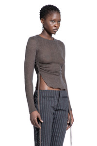 DESCRIPTION - Beaver - Jacquard wool jersey - Round neck - Side ruched gathering - Dropped shoulders - Long sleeves - Curved raw-edge hem - Cropped fit - Fitted DETAILS - Made in: Portugal - Composition: 80% Wool 20% Polyamide - Model code: B0012327FA619 060 - Item ID: 9785663095126 SIZE & FIT Model wears size S Model Height 177 cm Bust 74 cm Waist 58 cm Hips 85 cm
