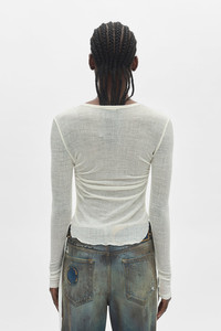 Oke Long Sleeve Crop Top - Natural White - Round Neck - Side Ruched Gathering - Curved Raw-Edge Hem - 80% Wool 20% Polyamide - Made in Italy Model wears size S The fit of the item is narrow. Please consider this when selecting your size . Care To maintain the beauty and integrity of your purchase, we recommend treating it with care. Simple maintenance practices, such as gentle washing and proper storage, can effectively preserve the longevity of your favorites. We encourage you to refer to the care instructions included with each item, designed to help you keep your purchase in top condition. Design Our dedication to excellence extends beyond materials; it encompasses the artistry and craftsmanship illustrated in every piece we create.