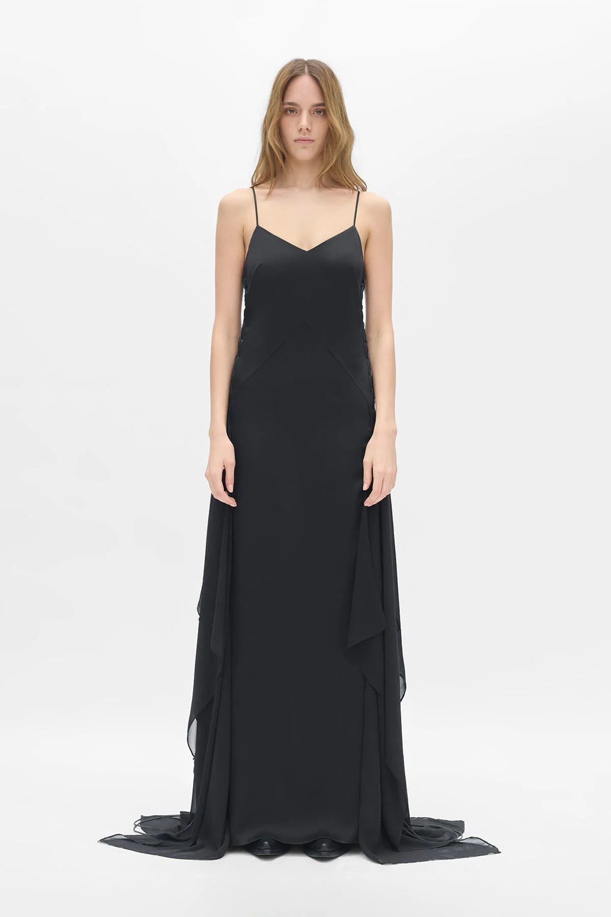 Ottilie Long Dress- Black - Cady Satin - V-Neck - Front And Back Western Stitching Seams- Back Zip Closures - Side Draped Panels - Floor length -73% Acetate 27% Viscose - Made in Italy Model wears italian size 40 The fit of this item is regular. Consider to purchase your usual size. Care To maintain the beauty and integrity of your purchase, we recommend treating it with care. Simple maintenance practices, such as gentle washing and proper storage, can effectively preserve the longevity of your favorites. We encourage you to refer to the care instructions included with each item, designed to help you keep your purchase in top condition. Design Our dedication to excellence extends beyond materials; it encompasses the artistry and craftsmanship illustrated in every piece we create.