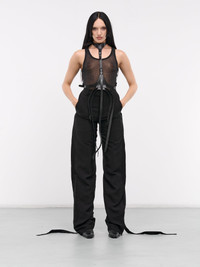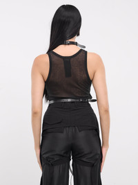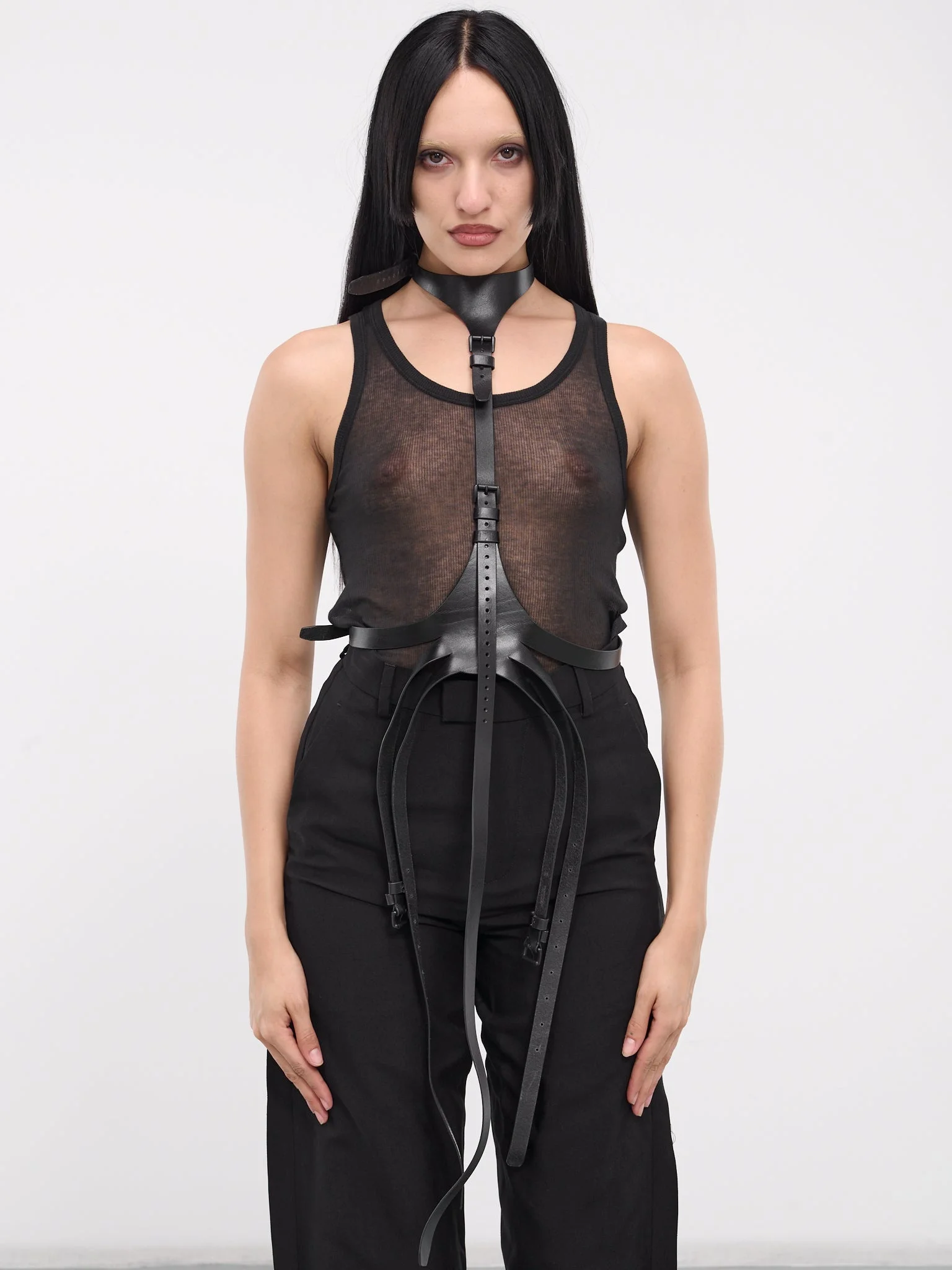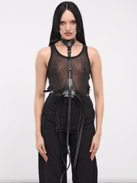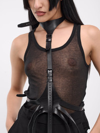ANN DEMEULEMEESTER belt in black, harness design, calfskin construction, neck harness, adjustable pin-buckle strap, waist triple adjustable pin-buckle belts, adjustable fit. Made in Italy 100% Calf Leather Standard Sizing