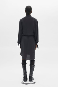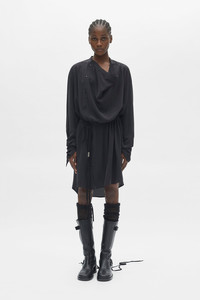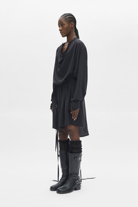 Raymonde Bib Front High Comfort Dress With Bandana Cuffs - Black - Lightweight Fluid Fabric - Draped Collar with Partial Button Placket - Elasticated Drawstring Waist – Relaxed Fit – Curved Hem, Longer at Back – Unlined - 100% Silk - Made in Italy Model wears italian size 40 The fit of this item is oversize. If you prefer a narrow fit, consider purchasing this item one size down from your usual size. Care To maintain the beauty and integrity of your purchase, we recommend treating it with care. Simple maintenance practices, such as gentle washing and proper storage, can effectively preserve the longevity of your favorites. We encourage you to refer to the care instructions included with each item, designed to help you keep your purchase in top condition. Design Our dedication to excellence extends beyond materials; it encompasses the artistry and craftsmanship illustrated in every piece we create.