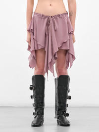 The pink skirt reinterprets the classic silhouette with a low waist, adjustable drawstring waistband, layered ruffle draping, and finished with an asymmetric mini hem. Featuring: • Relaxed fit • Low waist with belt loops • Adjustable drawstring waistband • Layered ruffle draping • Asymmetric hem • Mini length • Made in Italy • 100% Silk • Italian sizing Model is 5'8" wearing size 40. Bust: 28.5" Waist: 22.5" Hips: 33.5"