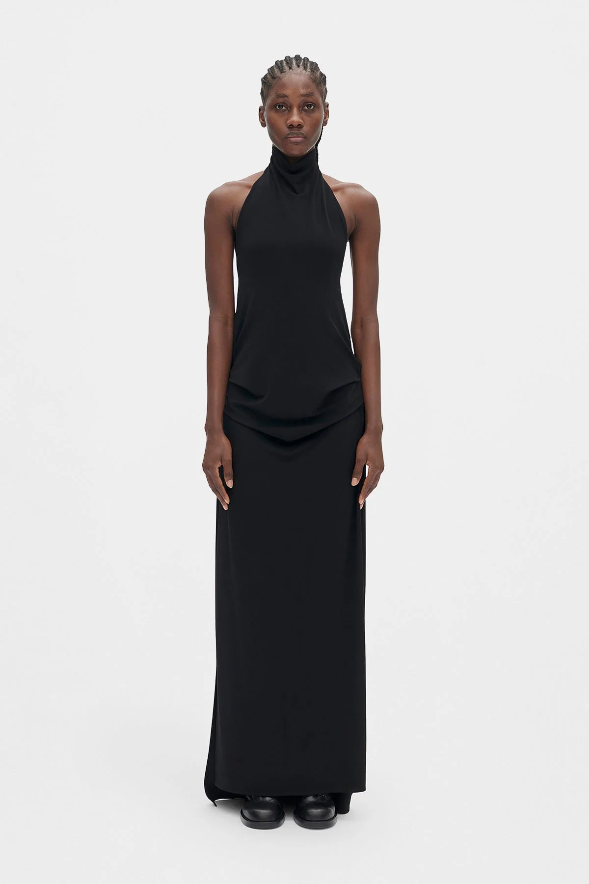 Rut Sleeveless Turtleneck Maxi Dress - Black - Crepe Viscose Jersey - Turtleneck - Gathered Waist - Sleeveless - Side Splits - Open Back - Back Buckled Strap - Raw-Edge Hem -92% Viscose, 8% Elastane - Made in Italy Model wears size S The fit of the item is narrow. Please consider this when selecting your size. Care To maintain the beauty and integrity of your purchase, we recommend treating it with care. Simple maintenance practices, such as gentle washing and proper storage, can effectively preserve the longevity of your favorites. We encourage you to refer to the care instructions included with each item, designed to help you keep your purchase in top condition. Design Our dedication to excellence extends beyond materials; it encompasses the artistry and craftsmanship illustrated in every piece we create.