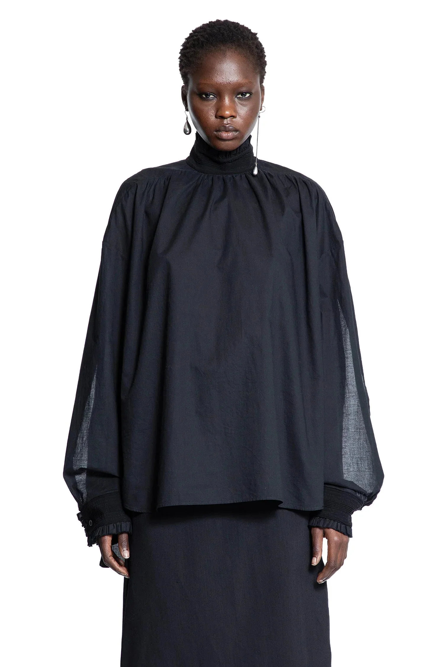 DESCRIPTION - Black - Light cotton - Frilled turtleneck - back button closure - Front gathered shoulder yoke - Long sleeves - Buttoned cuffs with frilled trim - Side splits - Back ruffled split - Dropped back - Loose boxy fit DETAILS - Made in: Italy - Composition: 100% Cotton - Model code: B0012826FA026 099 - Item ID: 9558354886998 SIZE & FIT Model wears size 36 Model Height 180 cm Chest 77 cm Waist 57 cm Hips 87 cm