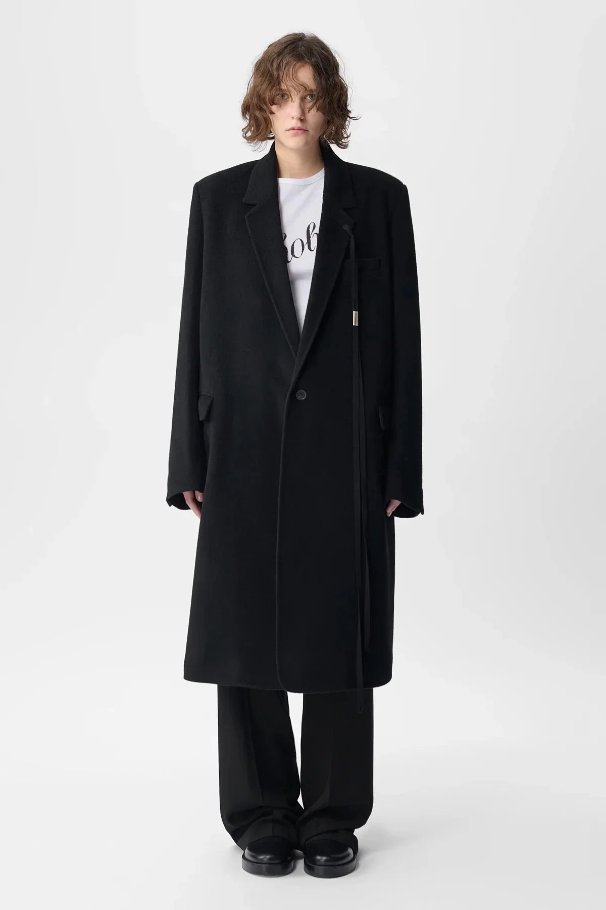 Women's black Viv slouchy long jacket- Black- Side pockets- Black ribbon detail- 95% Wool- 5% Cashmere- Made in Italy Model wears Italian size 40 Height: 182 cm Waist: 61 cm Hips: 89 cm