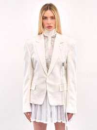 ANN DEMEULEMEESTER blazer in white, paneled mixed-material construction, notched lapel, signature grosgrain ribbon, structured shoulders, long sleeves, surgeon's cuffs, front button closure, side flap pockets, back cinch strap, Broderie Anglaise underlay paneling, needlework pattern & semi-sheer, stand collar, curved hem, tailored fit. Italian Sizing Model is 5'8" wearing size 38. Bust: 32" Waist: 24" Hips: 35"