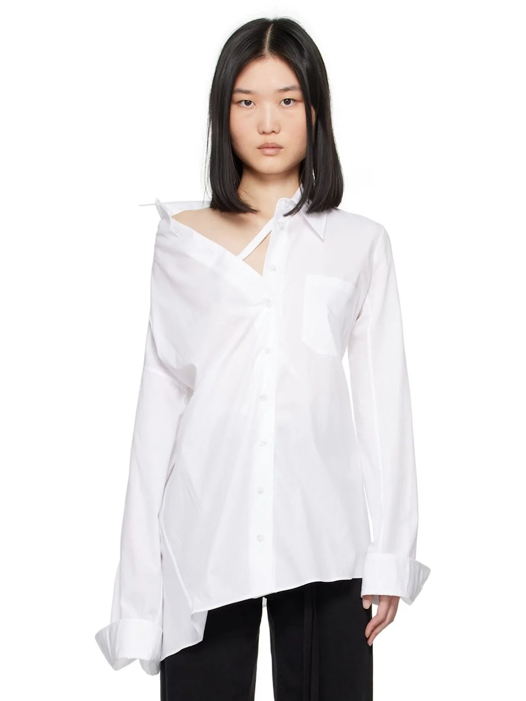 Cotton poplin shirt. · Asymmetric construction · Spread collar · Concealed grosgrain cinch strap at button closure · Patch pocket · Self-tie strap at front and interior · Dropped shoulders · Single-button barrel cuffs Supplier color: White