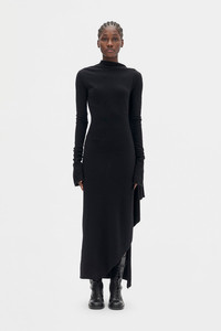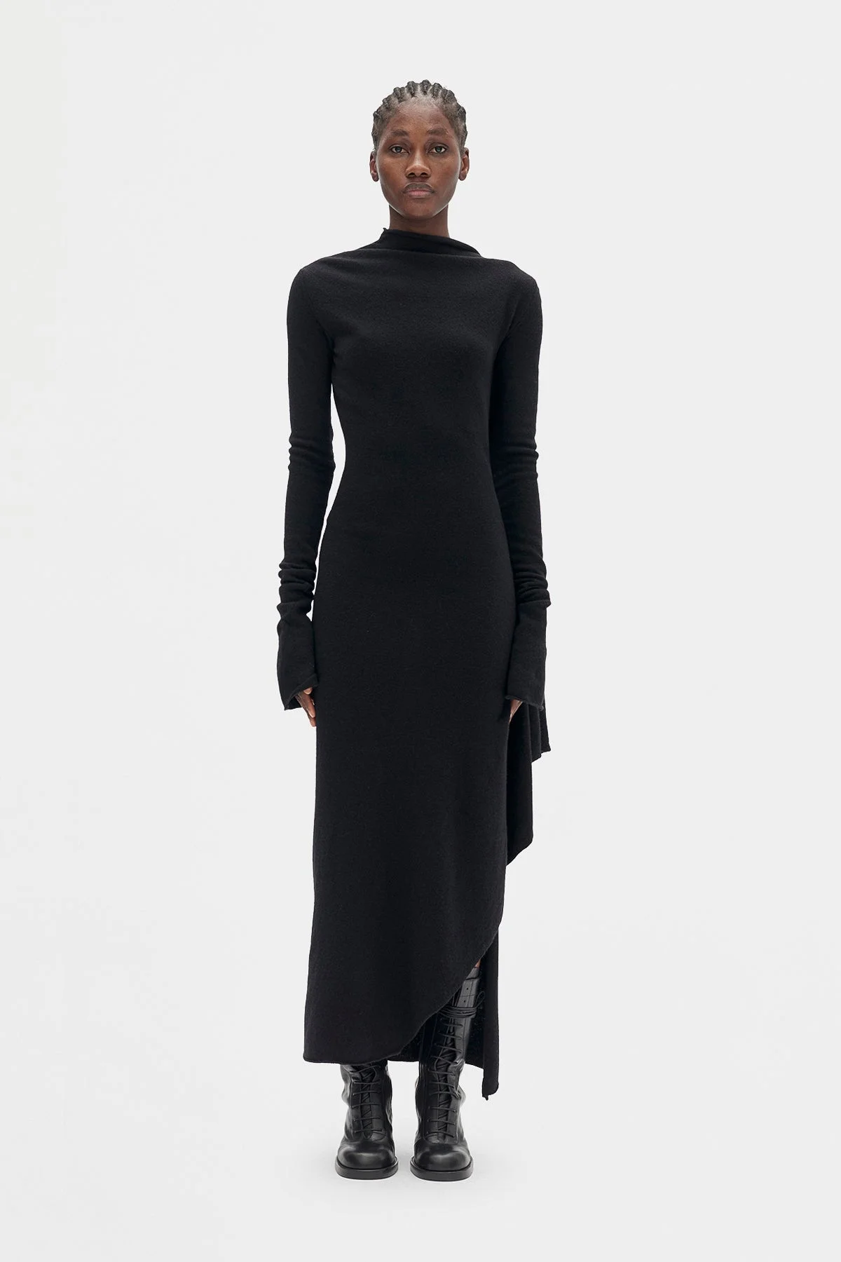 Vabu Long Dress - Black - Felted Wool Knit - Cowl Neck with Scarf Panel - Long Sleeves - Flared Cuffs - Side Split - Asymmetric Hem - Draped - Slim fit - 100% Wool - Made in Italy Care To maintain the beauty and integrity of your purchase, we recommend treating it with care. Simple maintenance practices, such as gentle washing and proper storage, can effectively preserve the longevity of your favorites. We encourage you to refer to the care instructions included with each item, designed to help you keep your purchase in top condition. Design Our dedication to excellence extends beyond materials; it encompasses the artistry and craftsmanship illustrated in every piece we create.