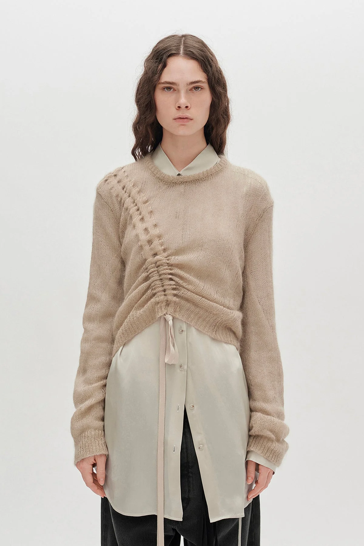 Zinaida Drawstring Sweater - Dust Nude - Brushed Mohair Silk Knit - Boat Neck - Drawstring Front - Dropped Shoulders - Ribbed Hem and Cuffs - Relaxed boxy fit - 70% Mohair, 30% Silk - Made in Italy Care To maintain the beauty and integrity of your purchase, we recommend treating it with care. Simple maintenance practices, such as gentle washing and proper storage, can effectively preserve the longevity of your favorites. We encourage you to refer to the care instructions included with each item, designed to help you keep your purchase in top condition. Design Our dedication to excellence extends beyond materials; it encompasses the artistry and craftsmanship illustrated in every piece we create.