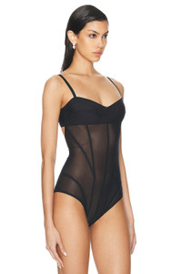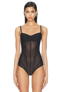 Details - 93% nylon, 7% elastane - Made in Ukraine - Dry clean only - Pull-on styling with back hook and eye closure - Adjustable shoulder straps - Gusset design bodysuit - Garment is intentionally sheer, undergarments will show through - Our Style No. AOCT-WS30 - Manufacturer Style No. SS2427