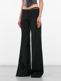 Black poly-viscose trousers with a utilitarian wide leg, cinched waist, and multi-buckle detailing that amplifies structure. Featuring: • Baggy fit • Low waist • Integrated cinch belt with buckle detailing • Concealed zip fly closure • Inset pockets • Wide leg • Made in Ukraine • 73% Polyester 25% Viscose 2% Elastane • Standard sizing Model is 5'10" wearing size S. Bust: 31” Waist: 22” Hips: 33”