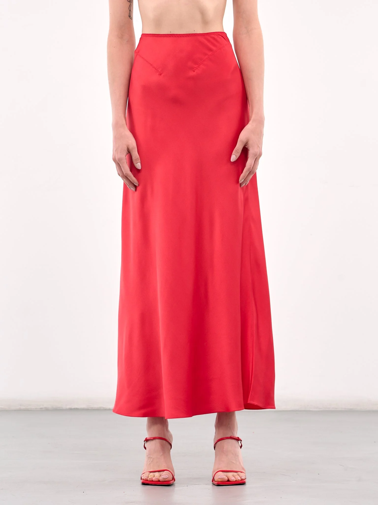 ANNA OCTOBER skirt in red, viscose-poly blend, paneled fluid construction, high waist, side concealed zip closure, flared hem, midi-length, relaxed fit. 57% Viscose 43% Polyester Standard Sizing Model is 5'9" wearing size S. Bust: 32" Waist: 23" Hips: 34"