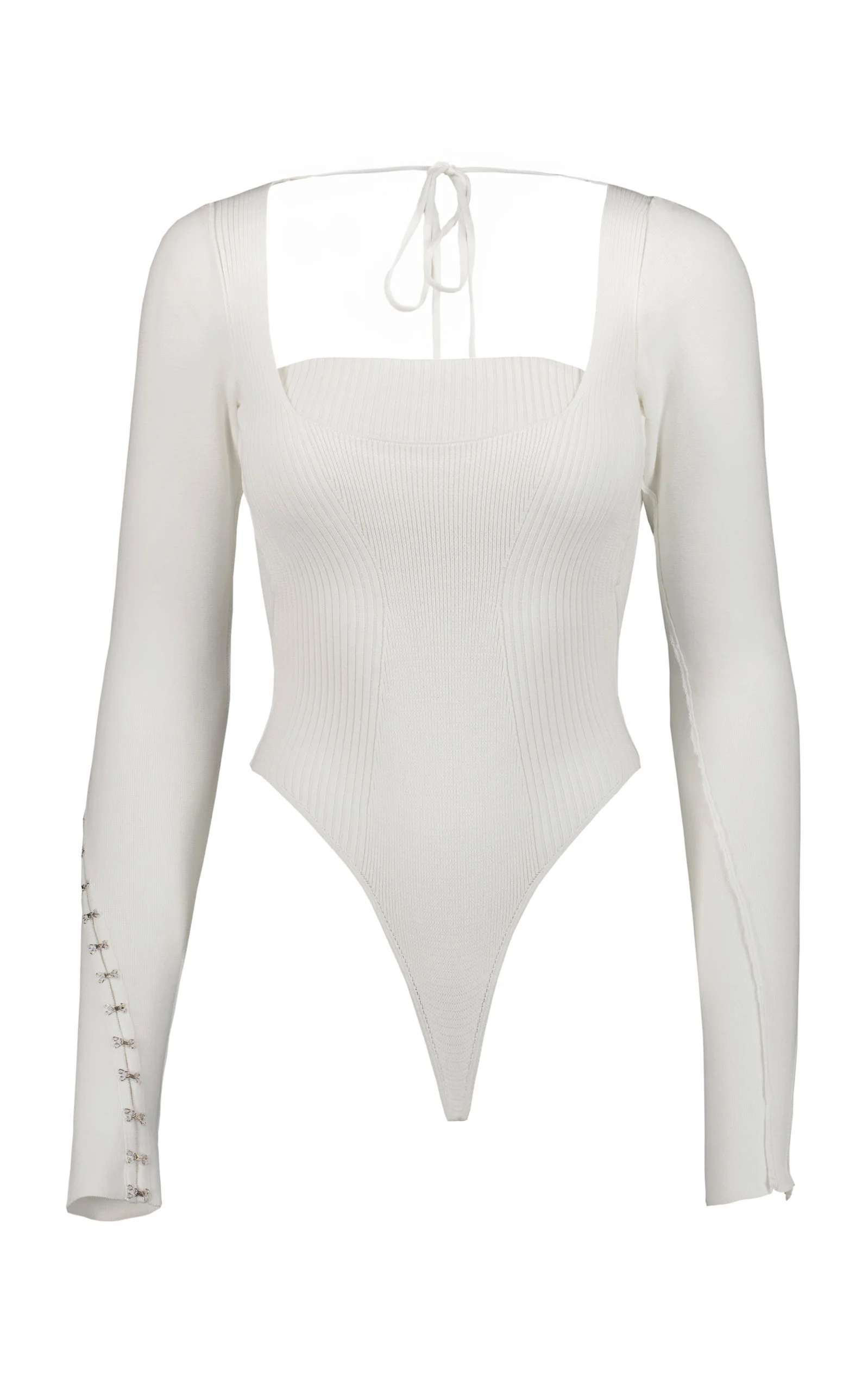 Knitted bodysuite with hooks PRODUCT DETAILS - Slim fit, square neck, long sleeves, clasp-fastened slit from underarms to cuff, unlined - slips on - This style fits true to size, we suggest taking your normal size - Composition: 95%VI 5%EA - Dry clean only - Imported SIZE & FIT - This item fits true to size