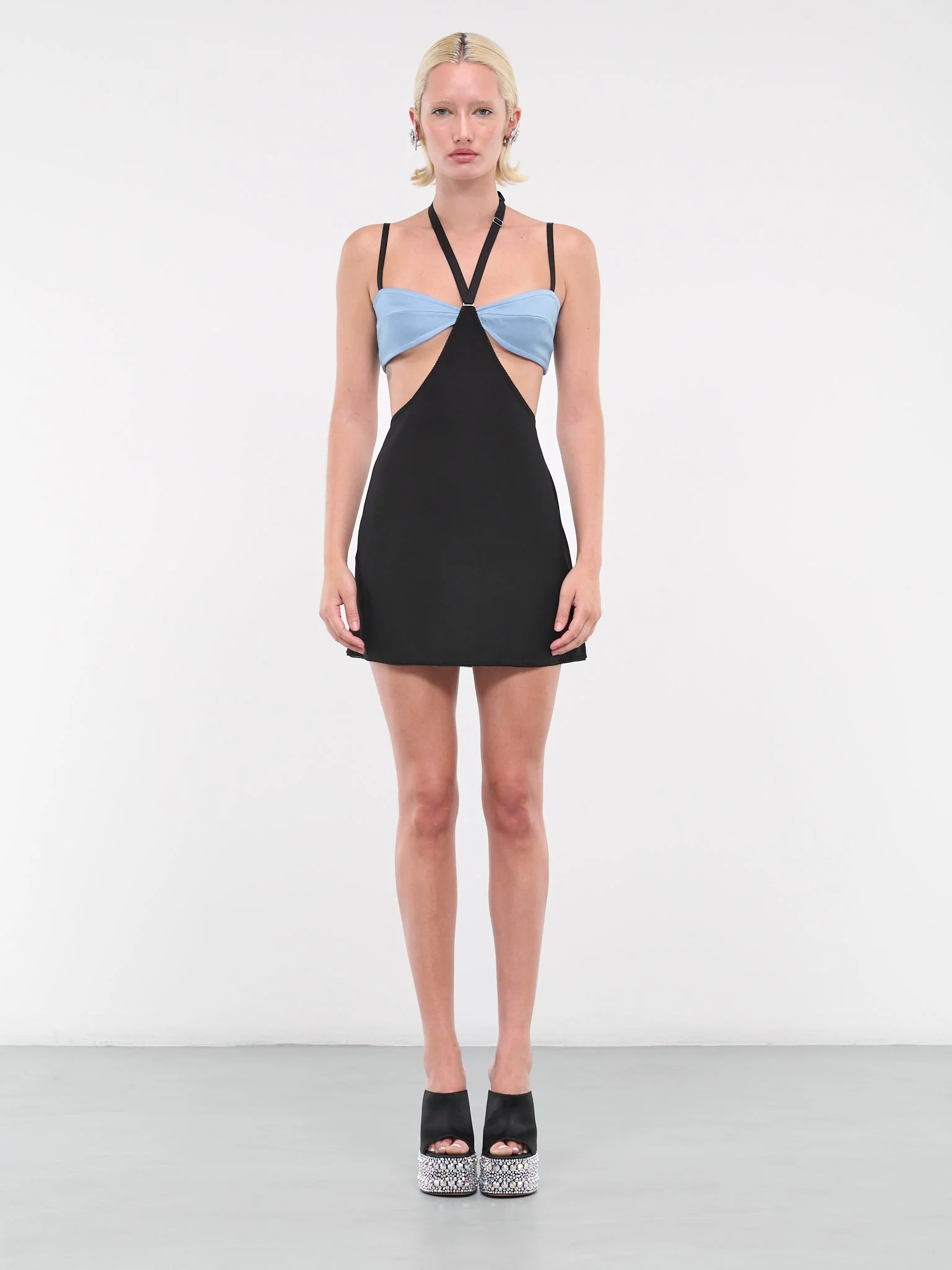 ANNA OCTOBER black dress, paneled design, contrast bra, adjustable halter neck & shoulder straps, back semi-elastic band, mini length, slim fit. Standard Sizing Model is 5'9" wearing size XS. Bust: 32" Waist: 24" Hips: 34"