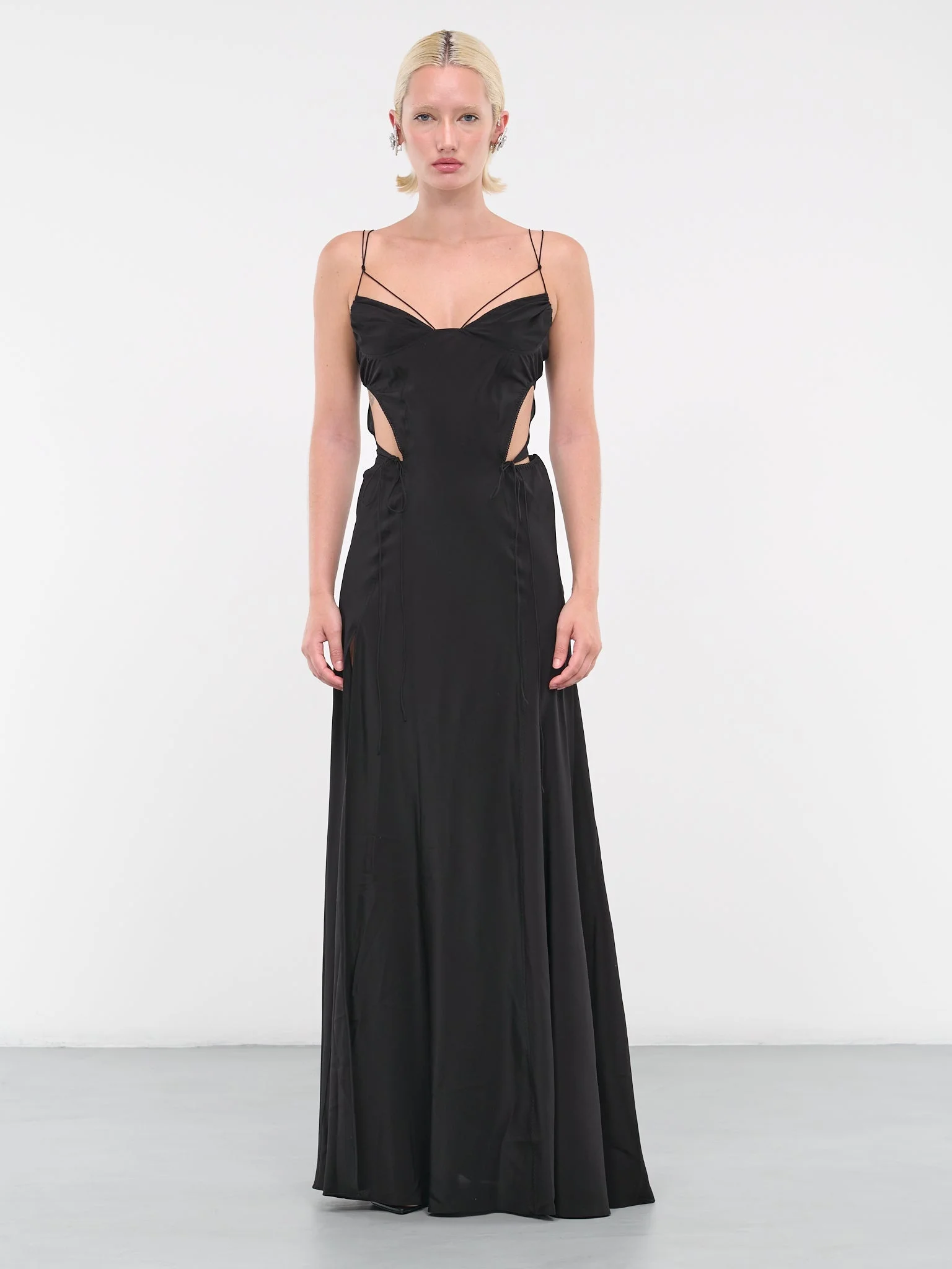 ANNA OCTOBER black dress, bias cut, side & back cut-outs, spaghetti straps, draped bra, adjustable hook & eye closure, front slit, maxi length, semi-fitted. 70% Viscose, 30% Polyester Standard Sizing Model is 5'9" wearing size S. Bust: 32" Waist: 24" Hips: 34"