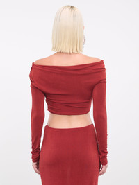 ANNA OCTOBER blouse in red, polyester-blend construction, off-shoulder, draped neck, elongated sleeves, ruched side, cropped length, fitted. Made in Ukraine 92% Polyester 8% Elastane Standard Sizing Model is 5'9" wearing size XS. Bust: 32" Waist: 24" Hips: 34"