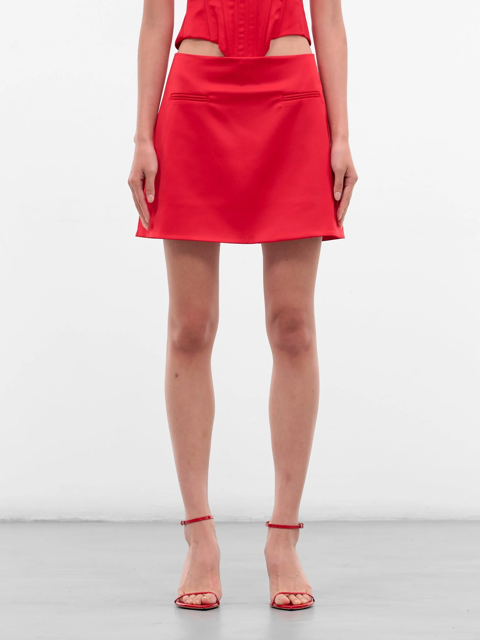 A red stretch mini skirt with a streamlined silhouette, designed with a high waist and subtle welt pockets. Featuring: • Slim fit • High waist • Front welt pockets • Back concealed zip closure • Mini length • Made in Ukraine • 96% Polyester 4% Elastane • Standard sizing Model is 5'10" wearing size S. Bust: 31” Waist: 22” Hips: 33”