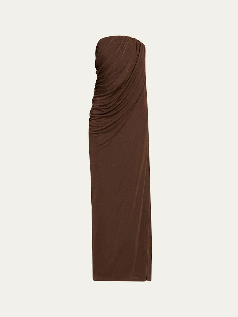 Crafted from soft mesh, the "Zella" dress by Anna Quan boasts elegant draping for an elevated, minimalist silhouette Strapless neckline Sleeveless Column silhouette Full length Zip closure Polyester/spandex Lining: Polyester Hand wash or dry clean Imported