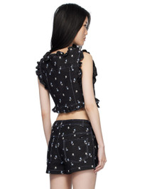 Non-stretch denim vest. Ruffled trim and floral pattern embroidered throughout. · Scoop neck · Press-stud closure · Curved cropped hem · Contrast stitching in blue Supplier color: Black/Multi Body: 100% cotton. Trim: 100% polyester. Made in United States 251894F111005